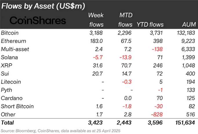 Sản phẩm đầu tư liên quan tới Bitcoin chiếm ưu thế tuyệt đối, thu hút 3,18 tỷ USD dòng vốn vào, giúp tổng tài sản quản lý (Assets under Management – AuM) của toàn thị trường tài sản số tăng trở lại mức 132 tỷ USD, mức chưa từng đạt được kể từ tháng 2/2025.