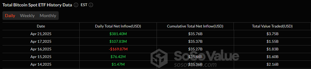 Thị trường ETF Bitcoin đã chứng kiến một ngày giao dịch đầy tích cực vào thứ Hai (21/4) khi ghi nhận 381,40 triệu USD dòng vốn mới đổ vào, đánh dấu ngày thứ hai liên tiếp với dòng tiền dương và thể hiện đà phục hồi mạnh mẽ trên diện rộng.
