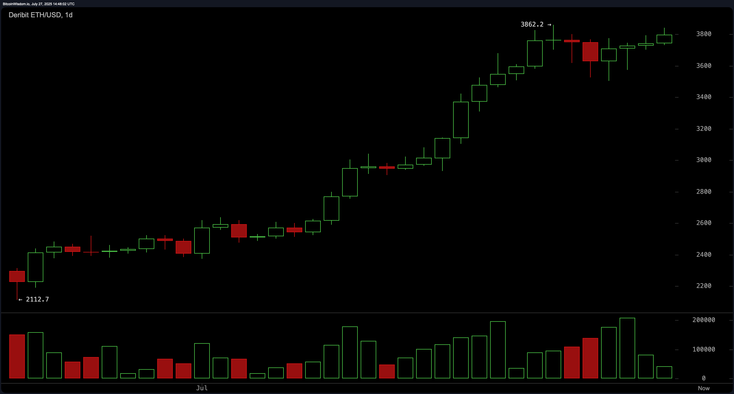 Ethereum đang khẳng định vị thế của mình với đợt tăng giá ấn tượng, vượt qua ngưỡng tâm lý 3.800 USD và tăng 2,2% trong 24 giờ qua. Tính đến 10:40 sáng giờ miền Đông, ETH được giao dịch ở mức 3.816 USD, tương đương khoảng 0,03221 BTC khi quy đổi sang Bitcoin. Với vị trí là tài sản số lớn thứ hai theo vốn hóa thị trường, ETH hiện đạt giá trị 460 tỷ USD, chiếm 11,8% tổng vốn hóa toàn thị trường tài sản mã hóa trị giá 3.910 tỷ USD.