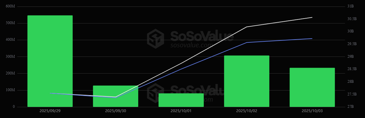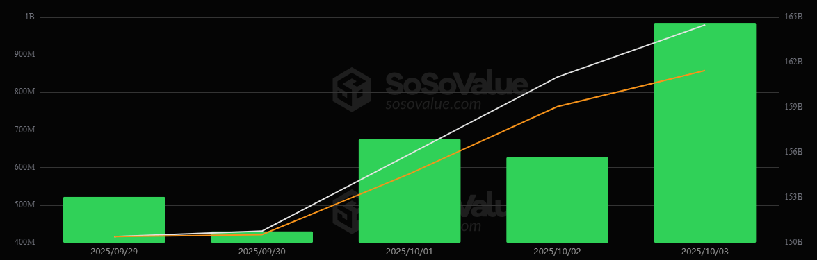 Các quỹ ETF Bitcoin và Ether thu hút 4,5 tỷ USD trong tuần đầu tháng 10, đánh dấu đà tăng mạnh nhất từ khi ra mắt với năm phiên liên tiếp ghi nhận dòng vốn vào.