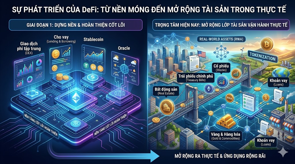 DeFi đã đi qua giai đoạn dựng nền, với các mảng cốt lõi như giao dịch phi tập trung, cho vay, stablecoin và oracle tương đối hoàn chỉnh. Trọng tâm hiện nay chuyển từ việc tạo thêm cấu trúc kỹ thuật mới sang mở rộng lớp tài sản có thể đưa vào vận hành thực tế. Điểm nghẽn lớn nhất không còn là thiếu công nghệ, mà là thiếu tài sản bảo đảm đủ chất lượng, thiếu nguồn lợi suất gắn với kinh tế thực và thiếu cầu nối đủ mạnh với dòng vốn tổ chức. Đây cũng là lý do tài sản token hóa đang được xem là hướng mở đáng chú ý nhất của DeFi trong giai đoạn 2026. (The Block, CoinDesk)