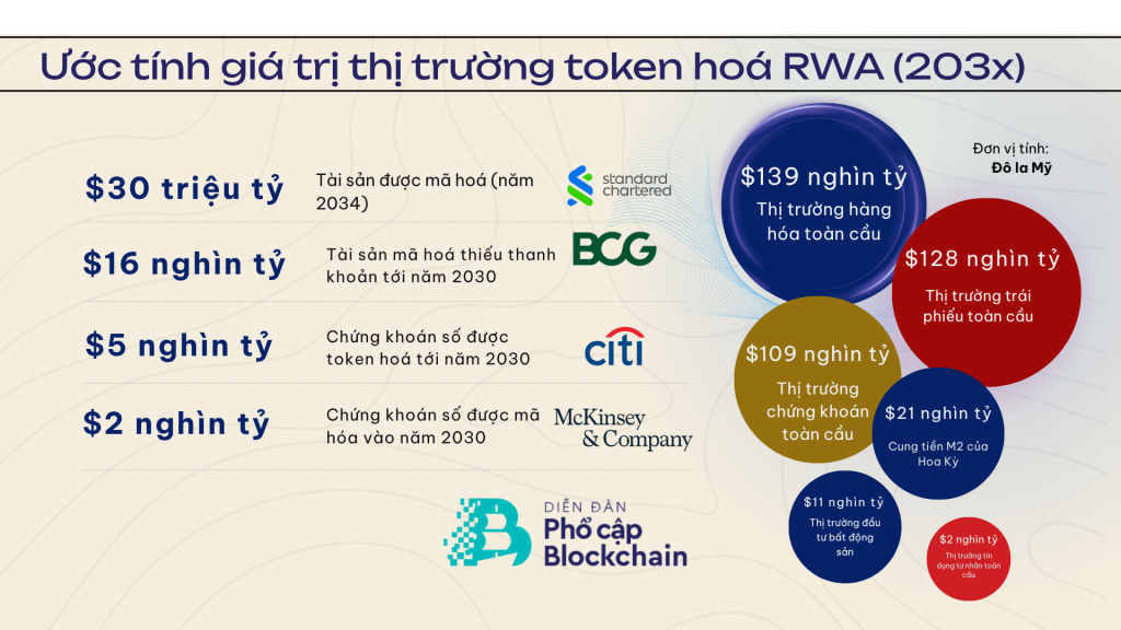 Tốc độ tăng trưởng hiện tại cũng là cơ sở cho các dự báo tham vọng hơn. Một số kịch bản thị trường đặt mục tiêu khoảng 400 tỷ USD cho nhóm tokenized assets vào cuối năm 2026. Ở tầm nhìn xa hơn, Standard Chartered ước tính thị trường token hoá tài sản thực, không tính stablecoin, có thể tiến tới khoảng 2.000 tỷ USD vào năm 2028. Dù đây vẫn là các kịch bản dự phóng, chúng cho thấy giới tài chính đang nhìn nhận token hóa không phải như một nhánh phụ của crypto, mà như một lớp hạ tầng tài sản mới có thể mở rộng theo quy mô thể chế.
