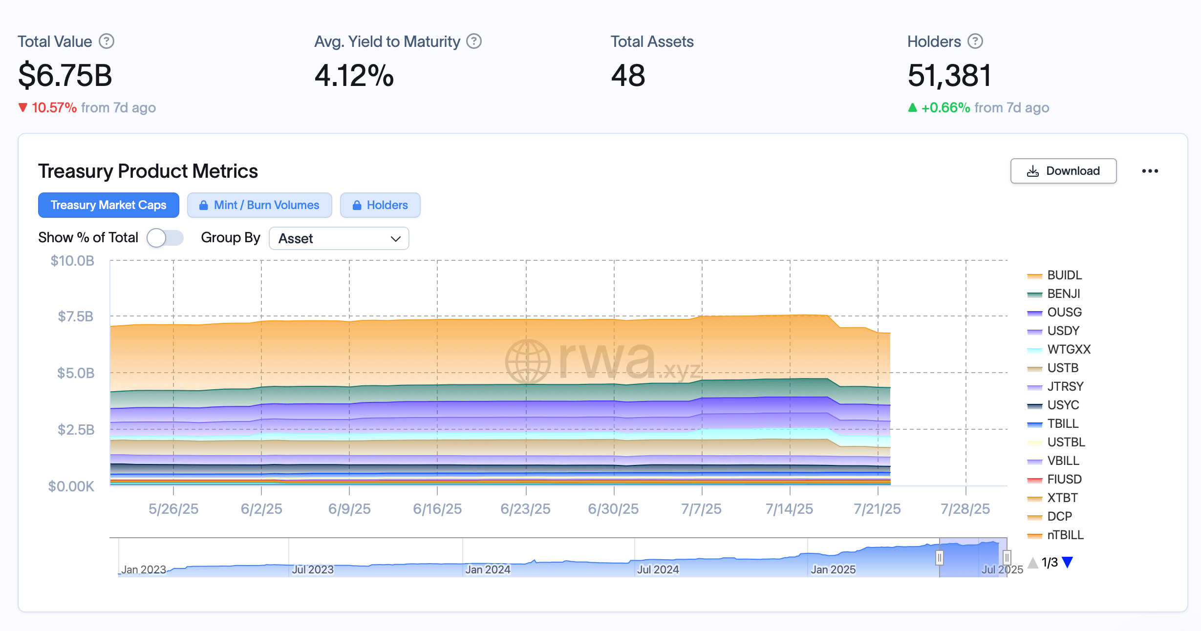 Thị trường trái phiếu kho bạc token hóa đang trải qua đợt điều chỉnh mạnh đầu tiên kể từ khi bắt đầu xu hướng tăng trưởng từ đầu năm 2025. Theo dữ liệu từ nền tảng rwa.xyz, quy mô thị trường đã giảm từ đỉnh lịch sử 7,55 tỷ USD vào ngày 16/7 xuống còn khoảng 6,75 tỷ USD, đánh dấu mức sụt giảm 10,57% chỉ trong vòng một tuần.
