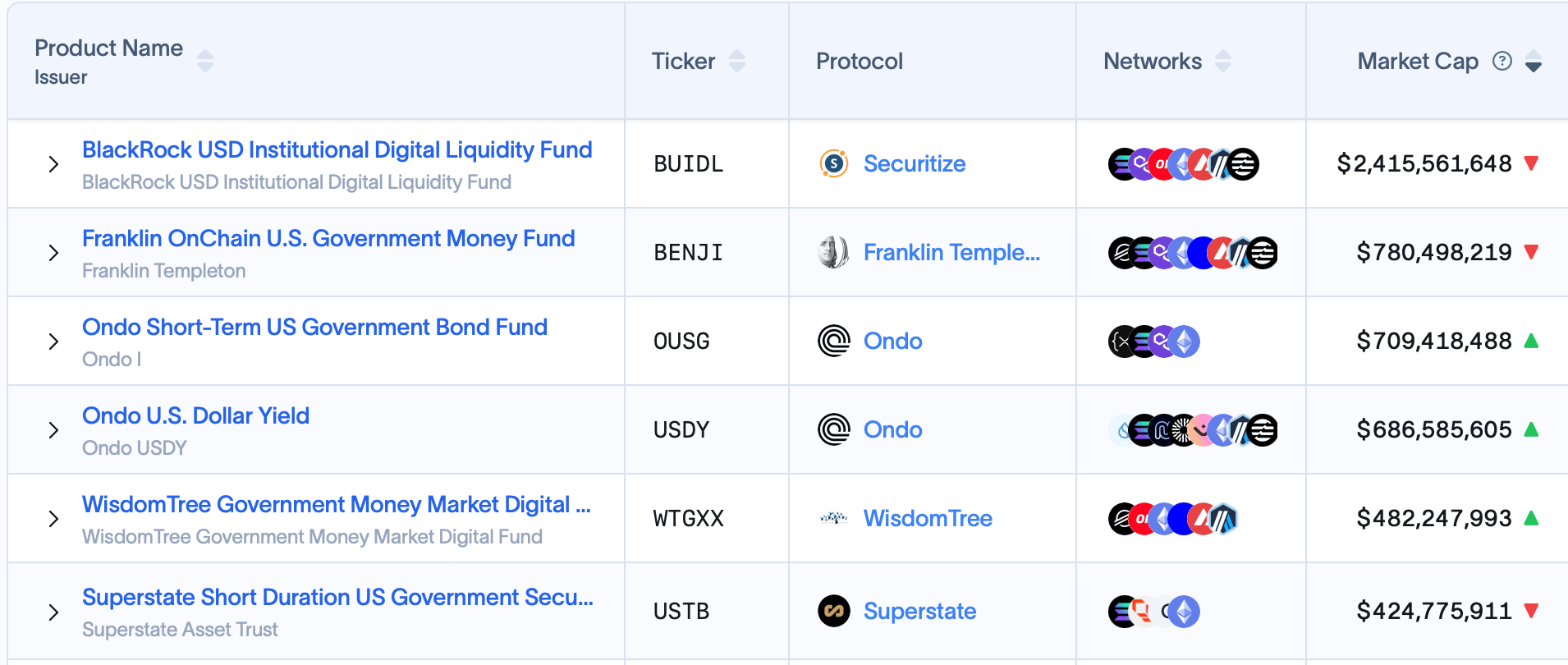 Trong bối cảnh thị trường chung suy yếu, một số sản phẩm vẫn cho thấy khả năng thu hút vốn. Ondo Short-Term U.S. Government Bond Fund (OUSG), hiện đứng thứ ba về quy mô, ghi nhận mức tăng nhẹ 0,12% trong tuần qua. Ondo U.S. Dollar Yield Fund (USDY) và WisdomTree Government Money Market Digital Fund (WTGXX) cũng duy trì mức tăng trưởng khiêm tốn.