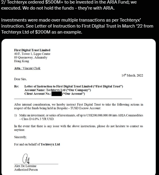 Để minh chứng cho tuyên bố của mình, FDT đã công bố một bức thư từ Techteryx gửi cho Tổng giám đốc FDT Vincent Chok, chỉ đạo đầu tư tới 200 triệu USD vào hàng hóa ARIA. Bức thư đề ngày 14/3/2022 có chữ ký của Alex de Lorraine, đại diện Techteryx, với nội dung yêu cầu ông Chok liên hệ nếu có bất kỳ thắc mắc nào về khoản đầu tư này.