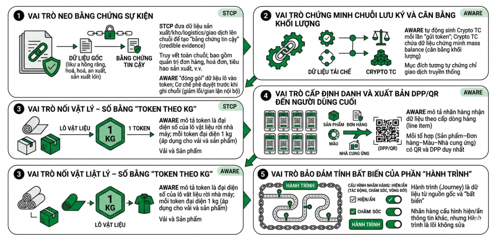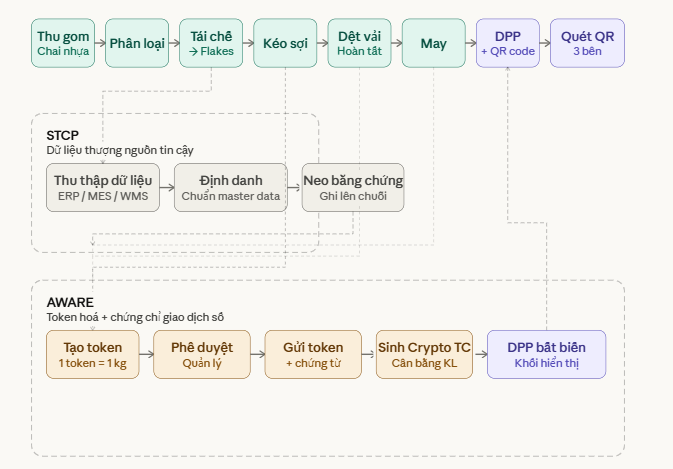 - AWARE mô tả token là đại diện số của lô vật liệu rời nhà máy; mỗi token đại diện 1 kg (áp dụng cho vải và sản phẩm).