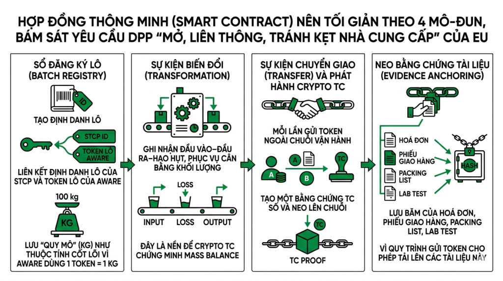 Hợp đồng thông minh (smart contract) nên tối giản theo 4 mô-đun, bám sát yêu cầu DPP “mở, liên thông, tránh kẹt nhà cung cấp” của EU: