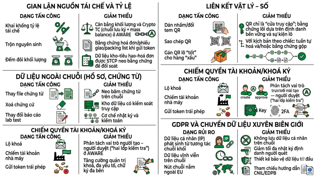 - Giảm thiểu: cân bằng khối lượng và Crypto TC (chuỗi lưu ký + mass balance) ở AWARE; bằng chứng hoá đơn/phiếu giao/packing list khi gửi token; dữ liệu kho–tiêu hao–hoá đơn được STCP neo bằng chứng để đối soát.