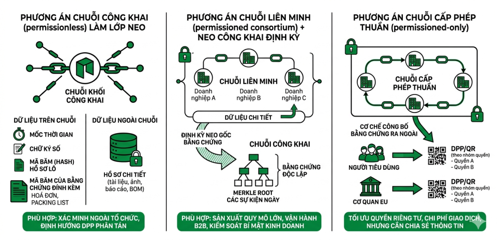- Kịch bản theo chiếc (item-centric): DPP/QR gắn theo từng sản phẩm; nếu ghi từng ánh xạ “chiếc ↔ lô” lên chuỗi sẽ bùng nổ giao dịch và chi phí; giải pháp thực tế là neo “bằng chứng gộp” (ví dụ gốc Merkle) để giữ chi phí thấp nhưng vẫn xác minh được từng chiếc.