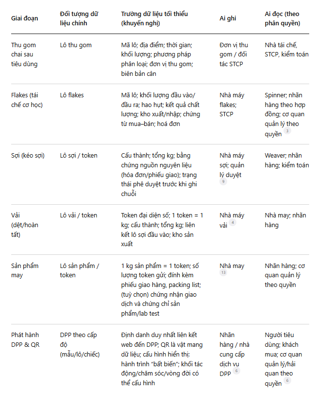 Trong pilot theo chuỗi “chai nhựa sau tiêu dùng → flakes → sợi → vải → sản phẩm may”, vai trò cốt lõi của chuỗi khối có thể định lượng theo số “sự kiện vật liệu” (material events) được neo bằng chứng: tạo lô, biến đổi lô, chuyển giao lô, phát hành DPP/QR. Báo cáo đưa ra hai kịch bản định lượng (giả định minh bạch):