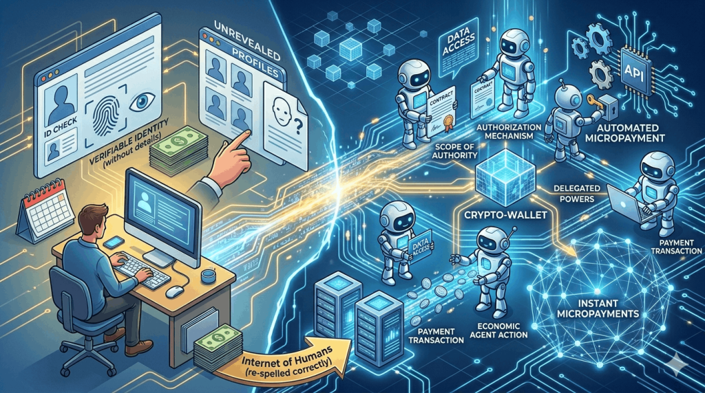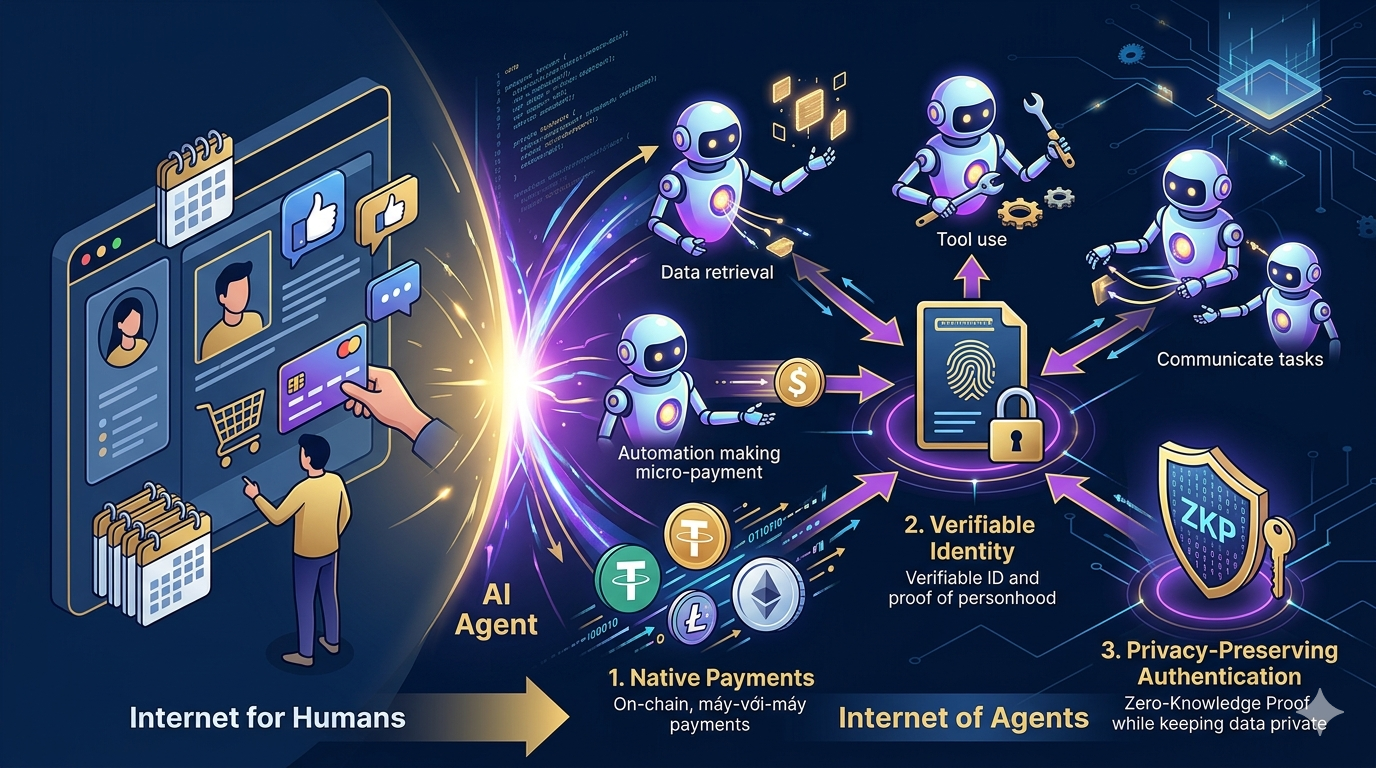 Khi trí tuệ nhân tạo chuyển từ vai trò hỗ trợ con người trả lời câu hỏi sang khả năng tự tìm dữ liệu, gọi công cụ, đưa ra quyết định ở phạm vi hẹp, thanh toán và thực hiện hành động thay mặt người dùng, Internet bắt đầu đối mặt với một thay đổi có tính cấu trúc. Hạ tầng số hiện nay phần lớn vẫn được thiết kế xoay quanh giả định trung tâm rằng chủ thể truy cập, giao dịch và chịu trách nhiệm là con người.